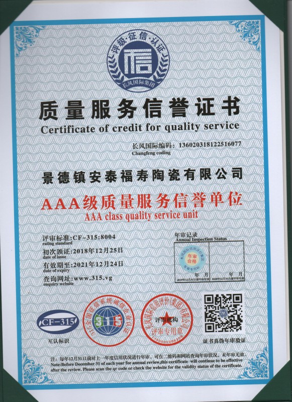 質(zhì)量服務(wù)證書